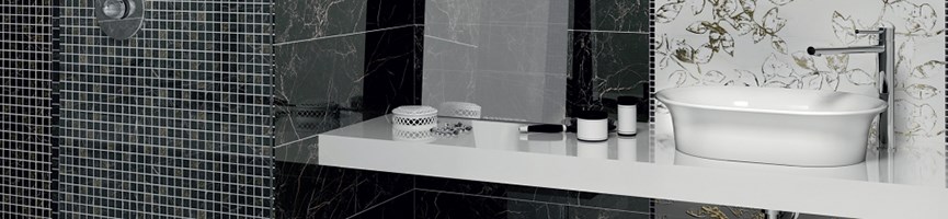 Керамическая плитка «Астория». Серия глянцевой настенной плитки с мраморной текстурой. Чёрная и белая цветовые гаммы позволяют оформлять совершенно разные с виду, но единые по направлению интерьеры в стиле модерн, сочетающие элегантность и изысканность со строгостью и монументальностью. Линейка декоративных элементов включает растительный орнамент, рисунок с изображением полевых цветов и птиц, а также мозаичные артикулы.