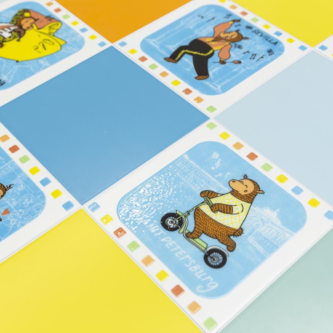 Керамическая плитка «Большое путешествие». Яркие чистые цвета и “детский” характер этой плитки создают беззаботную жизнерадостную атмосферу. Глянцевая поверхность делает окружение светлее. Декоративные вставки иллюстрируют путешествие мишки-талисмана KERAMA MARAZZI. Ставшая уже традиционной серия переходит из коллекции в коллекцию, сохраняя свой оптимистичный темперамент. Хорошо сочетается с серией “Калейдоскоп”.