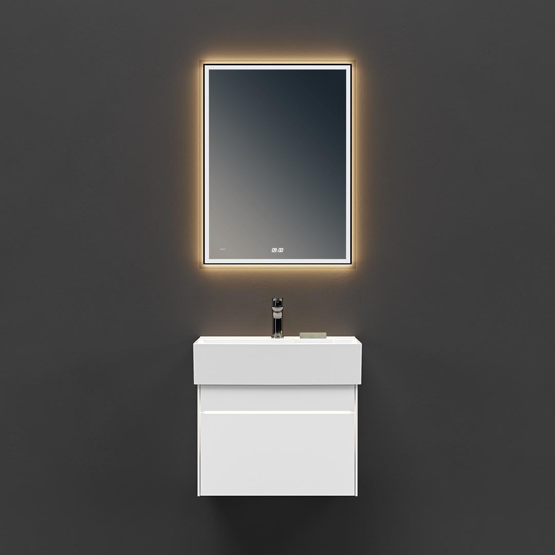 Подсветка прямоугольного зеркала Tecno включается и выключается бесконтактно по взмаху руки. Также регулируется характер освещения: холодное, тёплое, естественное. Функция «антизапотевание» и косметическая линза, доступная в зеркале шириной 90 см, делают новинку более удобной, а рама из прозрачного стекла с сатиновым эффектом и подсветка по периметру – современной и стильной.